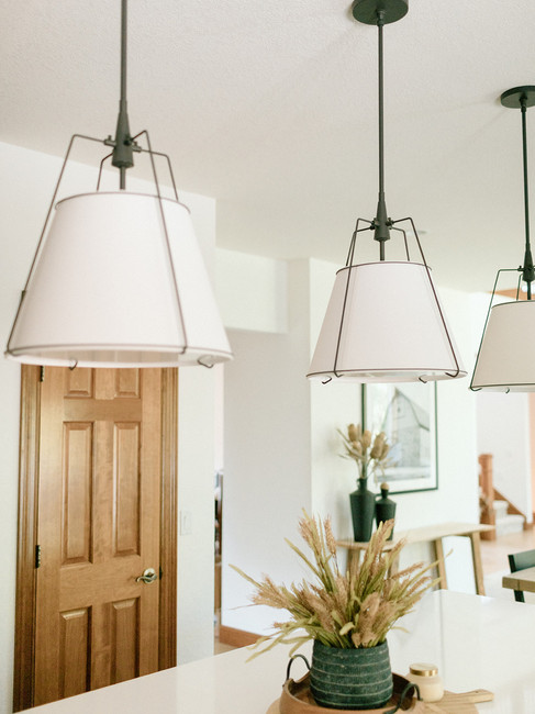 Stepping into the living room, the tall ceilings make the space feel grand and open, especially with the large windows that allow ample natural light to come through. To take advantage of the height, we opted for a beautiful farmhouse-style light fixture that immediately draws the eye upward when in this room.