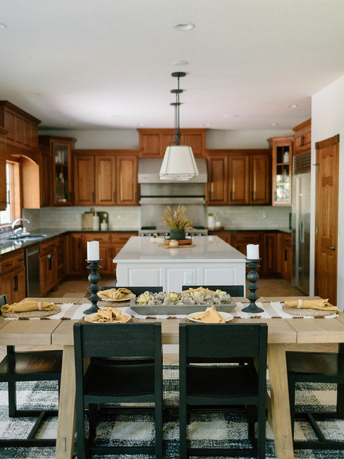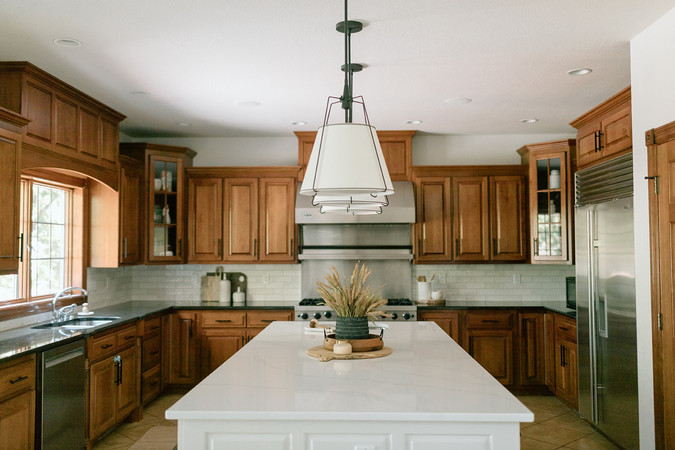 In the kitchen, we were able to keep the gorgeous wood perimeter cabinetry that adds a lot of warmth to the space. We also reconfigured the current island for crucial prep space and painted it to add dimension. Above the island, we selected gorgeous pendant lights that emphasize the ceiling height and create a nice focal point in the room.