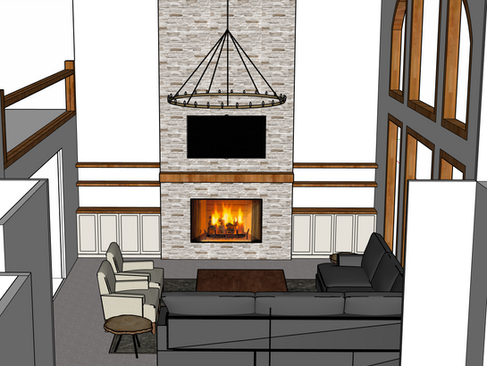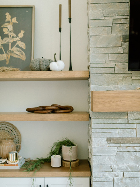 One of the biggest design elements we added to the living room was the floor-to-ceiling stone fireplace, complete with a wood mantel. Surrounding the fireplace, we designed both open shelving that matches the mantel and closed cabinetry from Showplace Cabinetry. This way, our client has space to display decor each season but also storage to keep other items out of sight but still within reach for easy access.